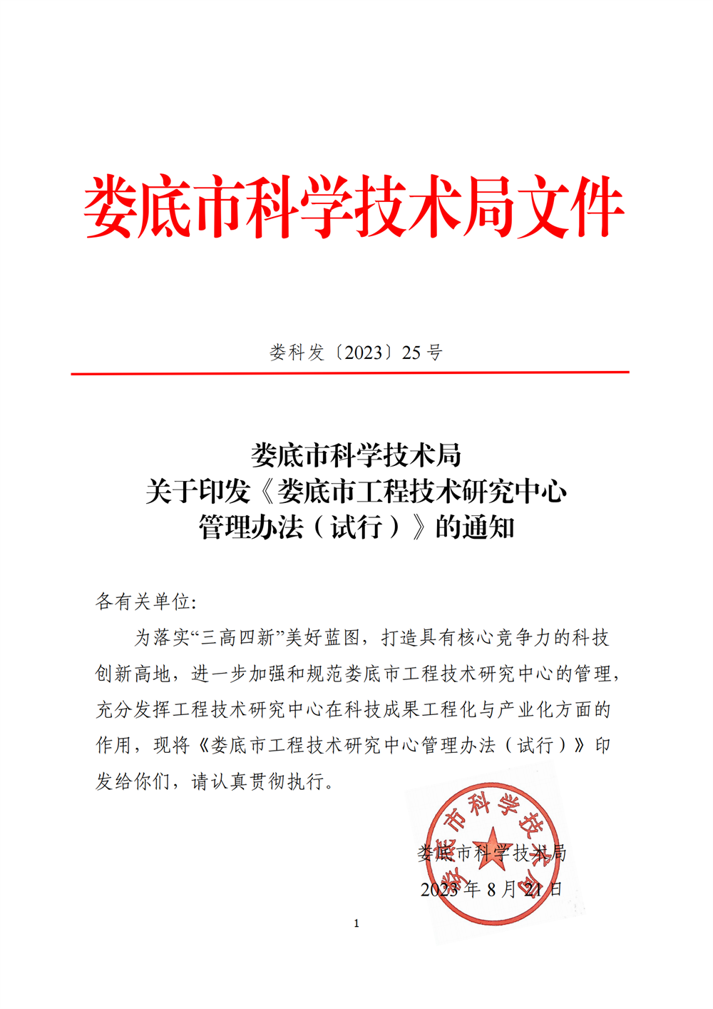 婁底市科學(xué)技術(shù)局關(guān)于印發(fā)《婁底市工程技術(shù)研究中心管理辦法(試行)》的通知