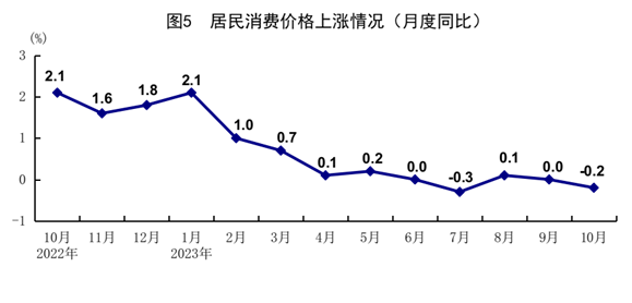 10月份,全國(guó)居民消費(fèi)價(jià)格(CPI)同比下降0.2%,環(huán)比下降0.1%。分類別看,食品煙酒價(jià)格同比下降2.1%,衣著價(jià)格上漲1.1%,居住價(jià)格上漲0.3%,生活用品及服務(wù)價(jià)格下降0.6%,交通通信價(jià)格下降0.9%,教育文化娛樂(lè)價(jià)格上漲2.3%,醫(yī)療保健價(jià)格上漲1.3%,其他用品及服務(wù)價(jià)格上漲3.6%。在食品煙酒價(jià)格中,豬肉價(jià)格下降30.1%,鮮菜價(jià)格下降3.8%,糧食價(jià)格上漲0.6%,鮮果價(jià)格上漲2.2%。扣除食品和能源價(jià)格后的核心CPI同比上漲0.6%。1-10月份,全國(guó)居民消費(fèi)價(jià)格同比上漲0.4%。